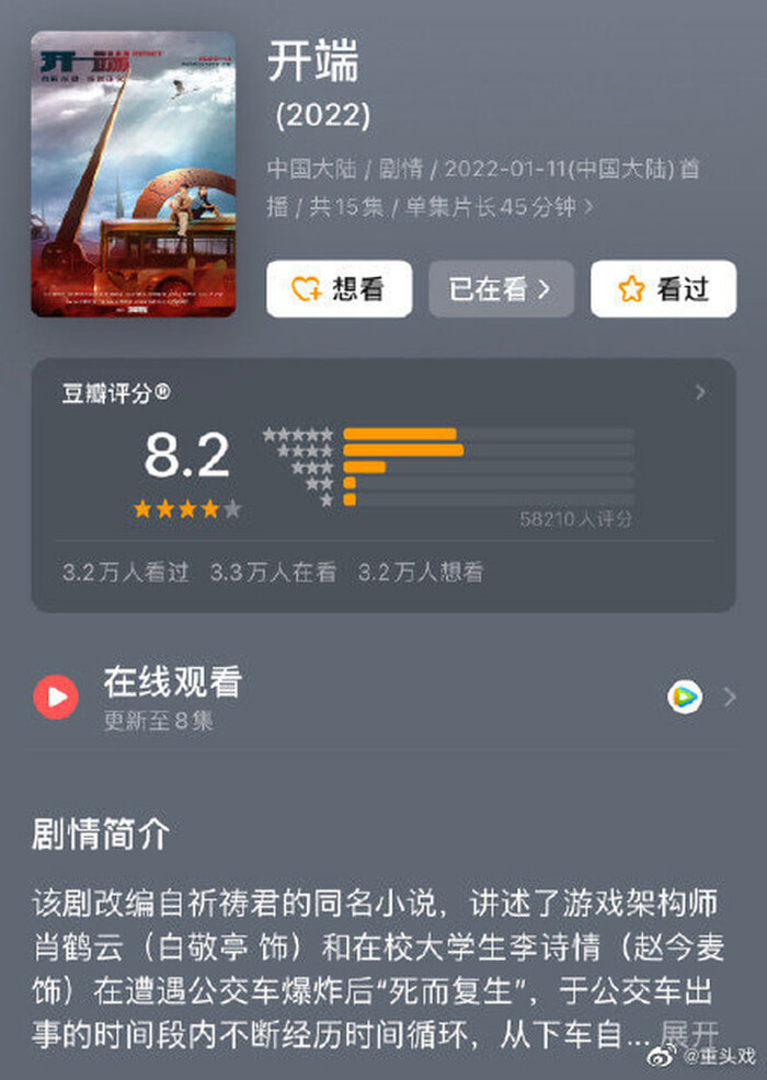 Thậm chí ngay sau khi mở điểm Douban, từ khóa "Khởi đầu được đánh giá 8,2 điểm" đã leo thẳng lên No.4 trên bảng hotsearch của mạng xã hội Weibo vào sáng hôm nay.