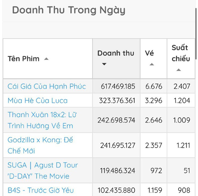 Theo thống kê từ Box Office, phim Việt 18+ Cái Giá Của Hạnh Phúc mới ra mắt vào ngày 19/4 đã ngay lập tức đứng vị trí hạng 1 doanh thu trong ngày. Phim vượt qua nhiều dự án đang được khán giả quan tâm khác như Thanh Xuân 18x2: Lữ Trình Hướng Về Em hay Godzilla x Kong: Đế Chế Mới để chiếm ngôi vương. Đến ngày thứ 3 ra rạp, tổng doanh thu của Cái Giá Của Hạnh Phúc đã vượt mức 10 tỷ đồng.