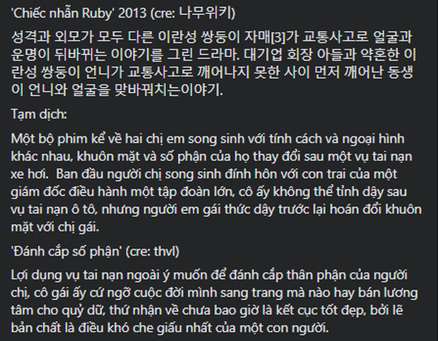 Lên sóng từ cuối tháng 11 vừa qua, bộ phim Đánh Cắp Số Phận khiến khán giả vô cùng quan tâm và đã nhanh chóng leo lên vị trí số 1 rating cả nước. Dự án đánh dấu màn hợp tác của "Hà Lan" Trúc Anh và "Yeye" Nhật Hạ, trong vai chị em song sinh Minh Anh - Mỹ Anh. Dù đang được xem nhiều và "gây sốt" màn ảnh nhỏ nhưng Đánh Cắp Số Phận đang bất ngờ dính vào ồn ào đạo nhái một phim Hàn ra mắt vào 10 năm trước.