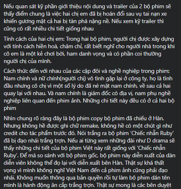 "Nhìn chung rõ ràng đây là bộ phim copy bộ phim đã chiếu ở Hàn. Nhưng không hề được ghi chữ remake, không hề có một chút gì như credit cho tác phẩm trước đó. Nói trắng ra bộ phim Chiếc Nhẫn Ruby đã bị đạo nhái trắng trợn", bài viết kết luận.