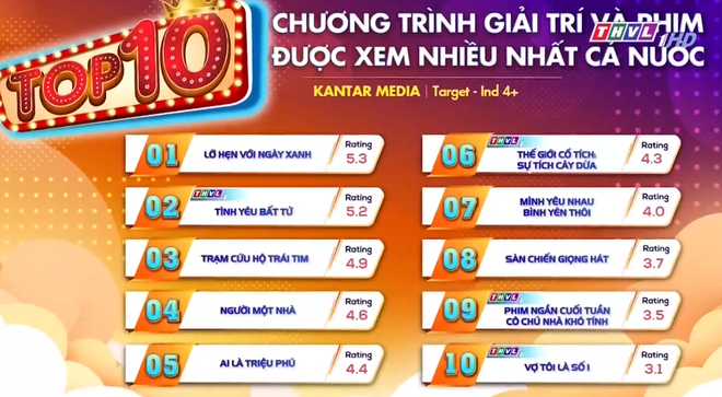 BXH rating Việt tuần qua tiếp tục chứng kiến sự biến động không nhỏ. Sau khi Bên Bờ Hạnh Phúc kết thúc, vị trí ngôi vương trên bảng xếp hạng, bất ngờ thay đã được nhường lại cho một bộ phim giờ vàng trên sóng VTV. Cụ thể bộ phim đứng top 1 trên BXH top 10 chương trình giải trí có rating cao nhất tuần qua gọi tên Lỡ Hẹn Với Ngày Xanh. Con số mà nó ghi nhận được là 5,3%, vừa đủ để nó vượt mặt bộ phim mới đến từ đài THVL - Tình Yêu Bất Tử với rating 5,2%.