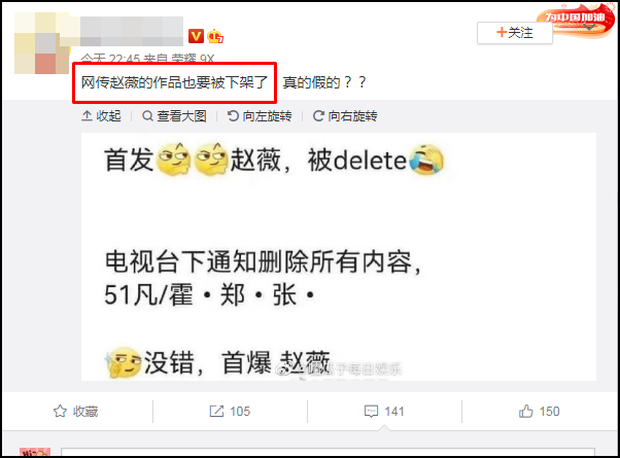 Theo nhiều blogger đưa tin, đài truyền hình đã gửi đi công văn yêu cầu xóa bỏ toàn bộ các sản phẩm phim ảnh lẫn show có Triệu Vy tham gia. Hiện tại, thông tin này vẫn chưa được xác nhận nhưng vẫn đang được fan Trung chia sẻ rầm rộ và khiến dư luận quan tâm.
