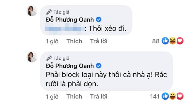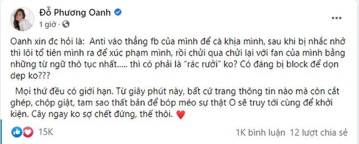Trước làn sóng chỉ trích từ netizen Việt, mới đây, Phương Oanh đã có bài đăng chia sẻ về cảm nhận của mình trong vụ việc. Nữ diễn viên bức xúc:"Oanh xin được hỏi là: Anti vào thẳng Facebook của mình để cà khịa mình, sau khi bị nhắc nhở thì lôi tổ tiên mình ra để xúc phạm mình, rồi chửi qua chửi lại với fan của mình bằng những từ ngữ thô tục nhất… thì có phải là “rác rưởi” không? Có đáng bị block để dọn dẹp ko???".