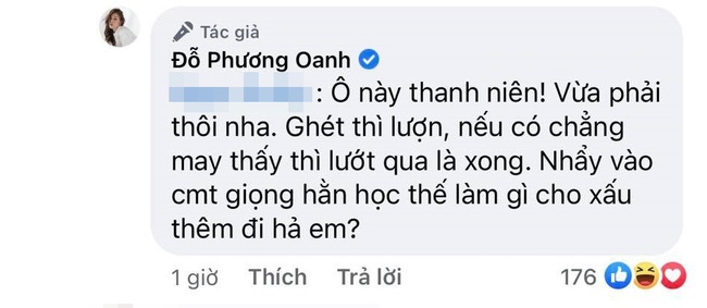 Cụ thể, trong một bài đăng của Phương Oanh, nữ diễn viên bị một anti-fan nhận xét cho rằng Phương Oanh diễn vừa lố vừa vô duyên, cứ đến đoạn của nhân vật Nam là tua. Đáp lại anti-fan, Phương Oanh viết: "Ghét thì lượn, nếu chẳng may thấy thì lướt qua cho xong, sao phải vào bình luận hằn học cho xấu thêm hả em?".