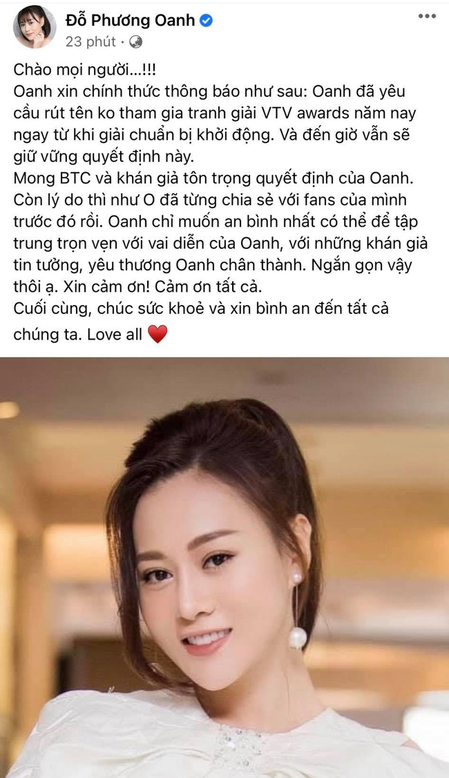 Phương Oanh viết: “Oanh xin chính thức thông báo như sau: Oanh đã yêu cầu rút tên không tham gia tranh giải VTV Awards năm nay ngay từ khi giải chuẩn bị khởi động. Và đến giờ vẫn sẽ giữ vững quyết định này”.