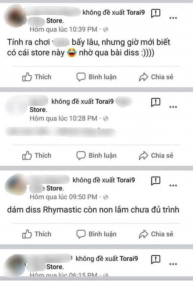 Không những thế, nguồn cơn của việc Torai9 nhận thua Rhymastic chóng vánh còn được cho là do cộng đồng fan rap kéo vào đánh giá shop bán đồ của anh. Theo đó, Torai9 đã đính kèm dòng trạng thái những hình ảnh cộng đồng mạng ồ ạt vào "không đề xuất" shop của anh và chê bai, chửi bới cách rap. Nhiều câu nhận xét như "diss Rhymastic thì không đủ trình" cũng được Torai9 công khai chia sẻ.