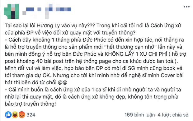 Vụ việc bắt nguồn từ status của quản lý "thánh nữ cover" Hương Ly tố Đức Phúc vô ơn vào đêm 8/10. Bài đăng chứa đựng những từ ngữ đầy hằn học và thách thức vô cùng khiếm nhã đến đối phương khiến netizen không khỏi bàng hoàng. Sau khi tiếp nhận thông tin này, sáng 9/10, ekip Đức Phúc đã lên tiếng phủ nhận. Lý giải về lý do Đức Phúc không vô ơn, ekip này cho biết quản lý Hương Ly đã ngỏ lời muốn cover lại ca khúc "Hết Thương Cạn Nhớ", nhưng vì sự việc xảy ra với Erik vừa qua nên ekip Đức Phúc "không muốn bị khán giả nghĩ rằng mình bỏ 20 triệu ra để thuê Hương Ly cover" nên đã không đồng ý.