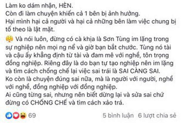 Ngay sau đó, quản lý của Quân A.P - người từng viết stastus về việc Jack đòi đổi người vì không muốn quay hình chung với "gà nhà" của mình lại có thêm một phát ngôn mới trên trang cá nhân.