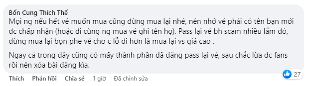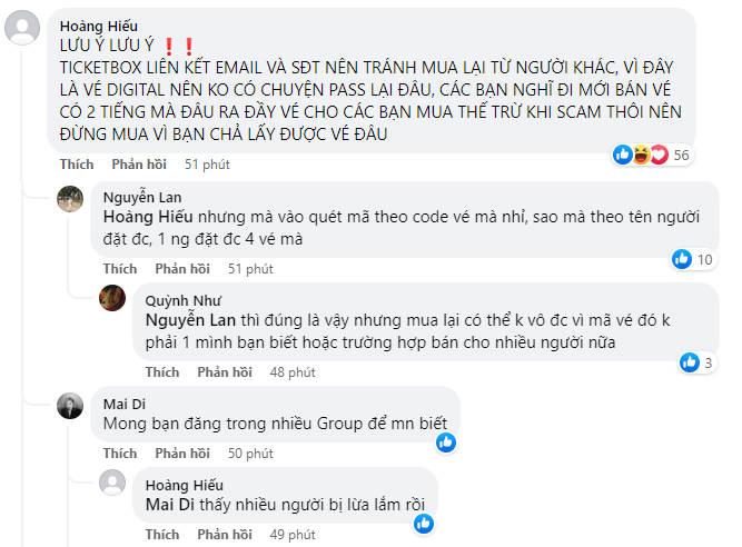 Một số người kêu gọi các fan hãy bình tĩnh, kiểm tra thật kỹ, không mua vé của những đối tượng không uy tín. Còn khoảng hơn 20 ngày nữa concert BlackPink mới diễn ra, vì vậy không nên mua lại vé vào thời điểm 'nóng' khi cổng bán vé vừa được mở cách đây ít giờ, tránh việc 'khát vé' dẫn đến tình trạng vé bị đẩy giá lên cao gấp nhiều lần giá gốc.