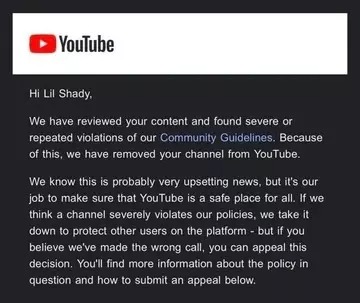 Ngày 4/8, trên fanpage chính thức, rapper Lil Shady thông báo bị YouTube xóa kênh. Lý do được phía nền tảng chia sẻ video lớn nhất hành tinh đưa ra là bởi tài khoản đăng tải nội dung vi phạm tiêu chuẩn cộng đồng.