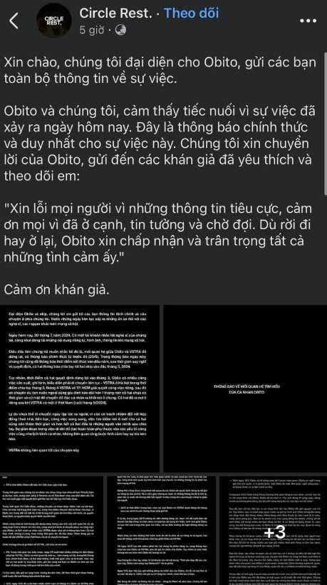 Tối 30/7, Obito chính thức lên tiếng về ồn ào tình ái. Nam rapper đăng tải tâm thư dài, giải thích cụ thể mọi chi tiết liên quan trong bài tố của fan girl tên N.. Nam rapper thừa nhận có hẹn hò với N., đồng thời làm rõ các mốc thời gian được nêu ra trước đó. Obito cũng gửi lời xin lỗi đến bạn gái cũ VSTRA vì vô tình khiến cô bị ảnh hưởng tiêu cực.