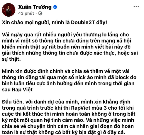 Khi drama đang chiếm sóng, vào tối 31/7, Double2T chính thức lên tiếng về toàn bộ những ồn ào xoay quanh bản thân. Về vấn đề tình cảm, Double2T cho biết: "Mình xin khẳng định trong quá trình trước khi thi Rap Việt mùa 3 cho tới khi cuộc thi kết thúc thì mình hoàn toàn không ở trong bất kỳ một mối quan hệ tình cảm nào. Và những việc mình chia sẻ về chuyện tình cảm cá nhân giai đoạn đó hoàn toàn là sự thật không có bất kỳ bịa đặt gì ở đây cả."