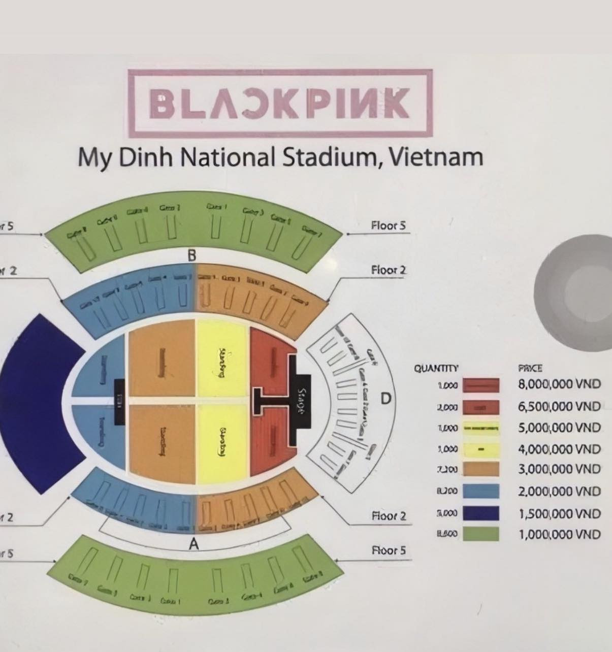 Mới đây, mạng xã hội xuất hiện hình ảnh được cho là sơ đồ về các vị trí ghế ngồi và giá vé concert BLACKPINK ở SVĐ Mỹ Đình, Hà Nội. Theo đó, giá vé sẽ dao động trong mức thấp nhất là 1 triệu đồng và cao nhất là 8 triệu đồng dành cho khu vực VIP.