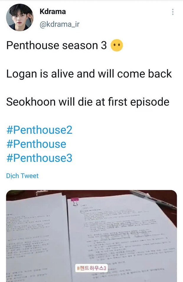 Cách đây ít ngày, cư dân mạng đã xôn xao trước thông tin Logan Lee (Park Eun Seok) sẽ sống lại và một nhân vật sẽ hi sinh trong Penthouse 3 (Cuộc Chiến Thượng Lưu 3). Mới đây, trên Twitter lan truyền cực mạnh tin đồn người tử nạn chính là Seok Hoon (Kim Young Dae) - chàng hoàng tử đẹp trai của Penthouse. Anh được cho là sẽ "ra đi" ngay từ tập 1.
