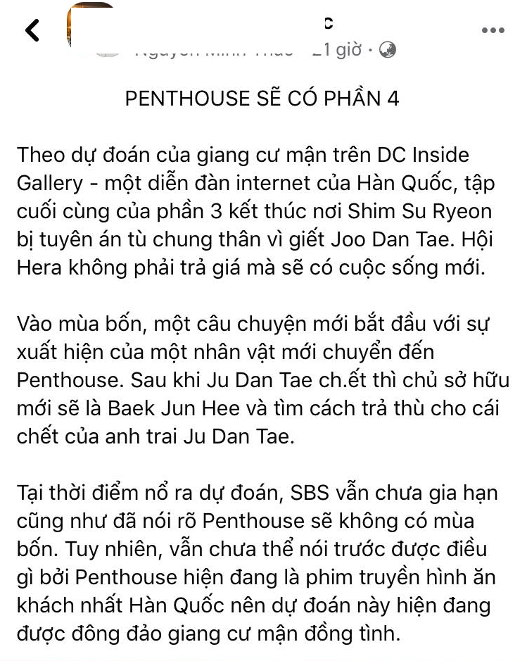 Thông tin này lập tức gây bão MXH, dân mạng Việt Nam tỏ ra ngán ngẩm nếu Penthouse kéo dài thêm một phần phim nữa. Theo đó, phần 3 sẽ khép lại khi Shim Su Ryeon đi tù chung thân vì giết Ju Dan Tae. Trong phần 4, Baek Jun Ki sẽ trở thành chủ nhân của căn Penthouse, lấy lại những gì mà hắn cho rằng Ju Dan Tae đã cướp của mình.