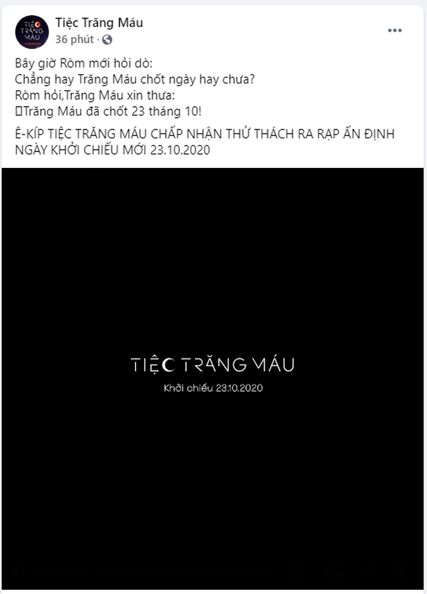 Theo đó, sau khi hoãn chiếu vào cuối tháng 8 do đợt tái bùng phát dịch COVID-19, vào ngày 2/10 ekip Tiệc Trăng Máu đã bất ngờ đăng tải dòng trạng thái xác nhận lịch chiếu mới là vào ngày 23/10, hứa hẹn sẽ tiếp tục khuấy động doanh thu phòng vé điện ảnh Việt sau dịch Covid-19.