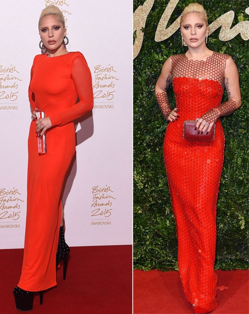 Lady Gaga mặc hai chiếc váy đỏ của Tom Ford, trong đó trang phục họa tiết da cá (phải) khoe được vẻ cá tính và vòng eo của cô. |