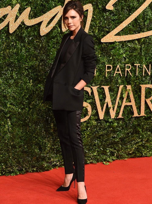 Victoria Beckham là một trong những ngôi sao hiếm hoi ăn mặc kín đáo. Cô diện vest tối màu khi tham gia sự kiện cùng David Beckham. |