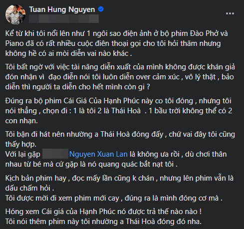 Tuấn Hưng cho biết sau khi nổi lên nhờ diễn xuất trong Đào, phở và piano , anh đã nhận được nhiều cuộc gọi nhưng đa phần toàn là khen ngợi chứ không có mời đóng phim. Chưa dừng lại ở đó, Tuấn Hưng còn "nửa đùa nửa thật" tiết lộ lý do anh không đóng Cái giá của hạnh phúc là vì Xuân Lan. " Với lại gặp Xuân Lan là không ưa rồi, dù chơi thân nhau từ bé mà cứ gặp là quang quác bắt nạt tôi ", Tuấn Hưng ghi trong status.