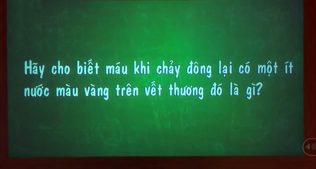 Câu hỏi liên quan đến kiến thức cơ bản của học sinh lớp 3 có nội dung “Hãy cho biết máu khi chảy đông lại có một ít nước màu vàng trên vết thương đó là gì?”, cựu HLV The face 2016 đã đưa ra đáp án cuối cùng là Nước màu vàng. Còn đáp án đúng chương trình là Huyết tương.