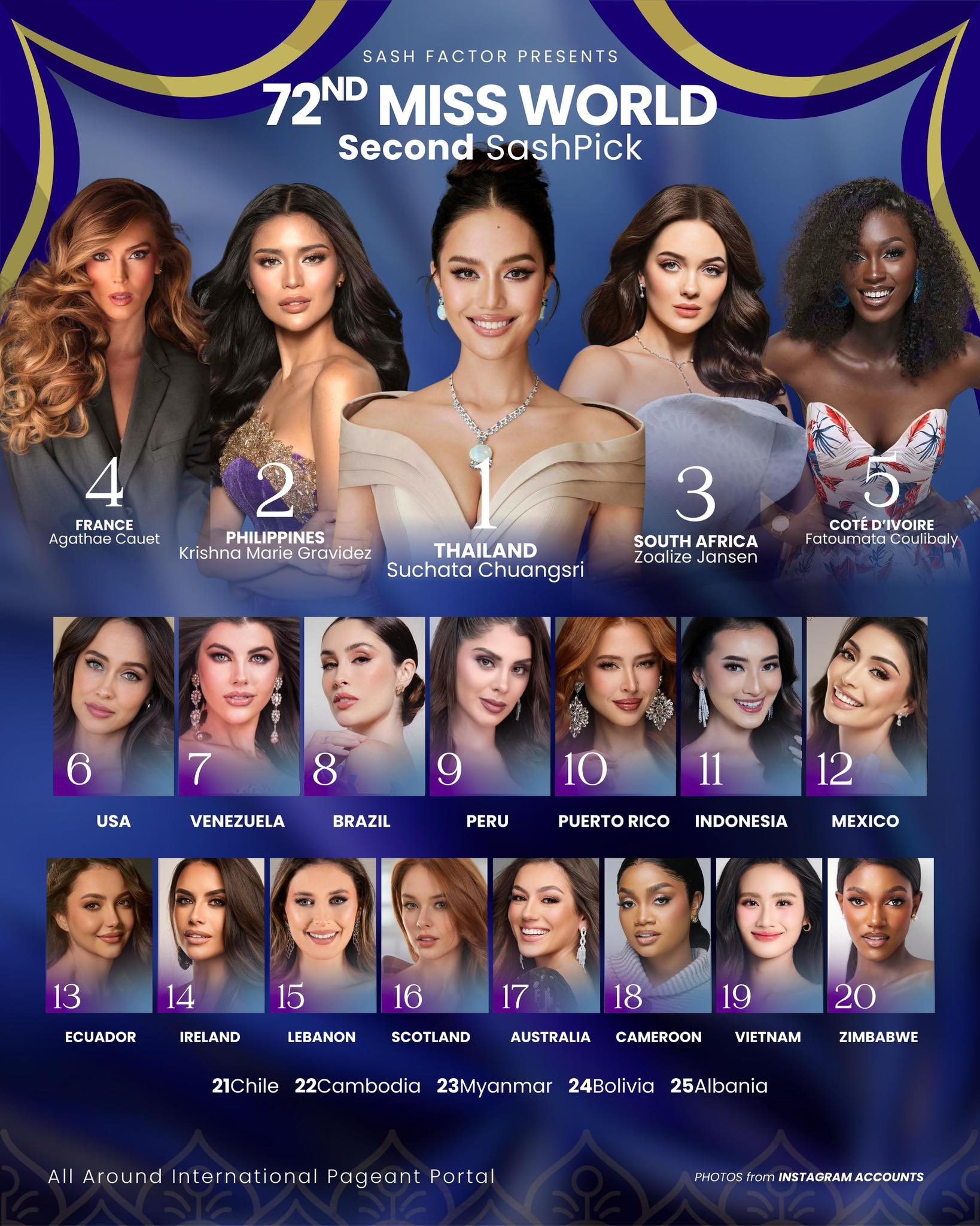 Mới đây, chuyên trang sắc đẹp Sash Factor bất ngờ công bố bảng dự đoán kết quả cuộc thi Miss World 2025. Nếu như trước đó, Ý Nhi từng được xếp vào nhóm thí sinh tiềm năng, Top 10 hay Top 15 liên tục gọi tên Việt Nam, thì ở bảng xếp hạng lần này, nàng hậu Gen Z rớt xuống vị trí 19. Đồng thời, đại diện Thái Lan được đánh giá cao nhất, được Sash Factor dự đoán sẽ đăng quang Miss World năm nay.