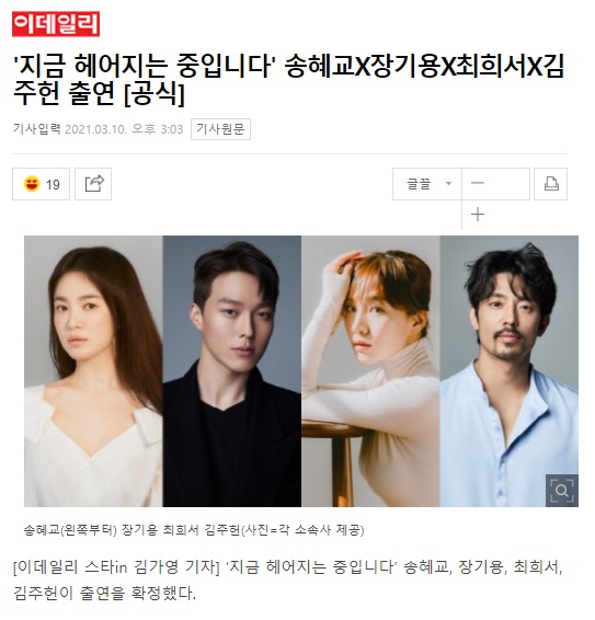 Theo đó mới đây phía nhà sản xuất Now, We Are Breaking Up đã chính thức xác nhận Song Hye Kyo sẽ nên duyên cùng với đàn em kém tuổi Jang Ki Yong. Bên cạnh đó, Choi Hee Seo và Kim Joo Hun cũng đã xác nhận góp mặt trong dự án truyền hình này.