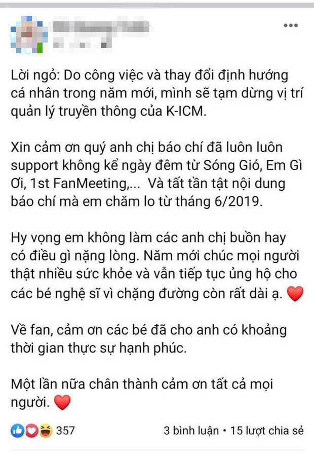 Trong dòng trạng thái vừa đăng tải trên facebook cá nhân, quản lý truyền thông của K-ICM cho biết bản thân sẽ tạm dừng công việc này do vấn đề về công việc và định hướng cá nhân trong năm mới. Anh chàng cũng gửi lời cảm ơn sâu sắc đến mọi người đã luôn ủng hộ cho K-ICM và Jack trong suốt thời gian qua.