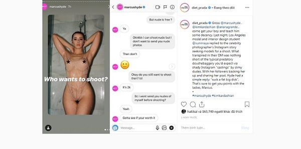 Trước đó không lâu, loạt báo đã đăng tin nhiếp ảnh gia Marcus Hyde , người được biết từng làm việc với Kim Kardashian , Ariana Grande có những lời nói không tôn trọng phụ nữ khi yêu cầu người mẫu trẻ có tên Sunnaya gửi ảnh khỏa thân trước rồi mới chịu chụp hình miễn phí không thì vẫn sẽ tính tiền với giọng điệu “mặc cả” khiến cả cộng đồng mạng vô cùng phẫn nộ.