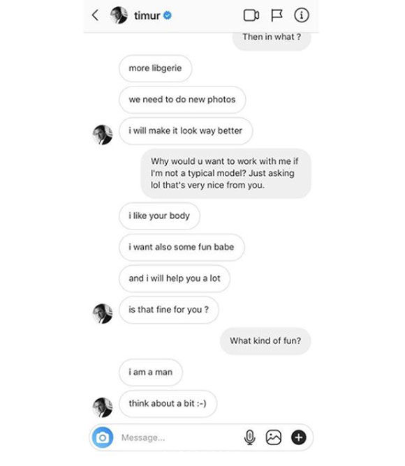 Nhờ có sự “giúp sức” của trang Diet Prada nhanh chóng đưa loạt thông tin, cư dân mạng đã thấy toàn bộ hình ảnh và những đoạn chat gạ tình giữa Timur và loạt nạn nhân là các dàn mẫu trẻ khác, thậm chí trong các tin nhắn của một số người mẫu, họ còn cáo buộc Emek đã có hành vi ” hãm hiếp” khi xuất hiện tại studio nhà riêng của anh để chụp hình