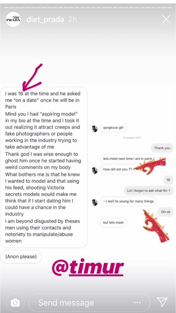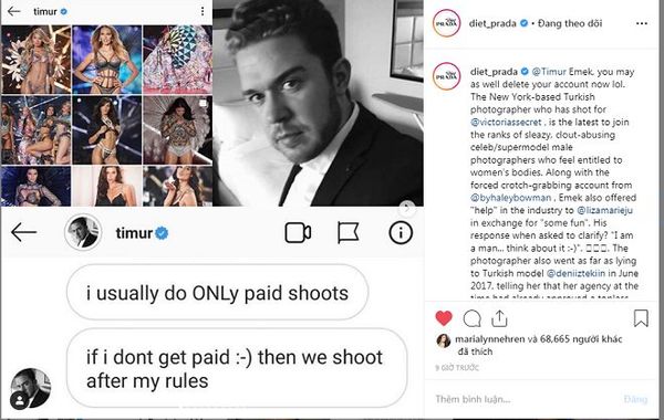 Mới đây, Diet Prada tiếp tục “thay trời hành đạo” khi tiếp tục bóc phốt nhiếp ảnh gia Timur Emek - người chuyên chụp hình cho dàn mẫu Victoria's secret về tội quấy rối tình dục và có hành vi “hãm hiếp” với dàn mẫu trẻ.