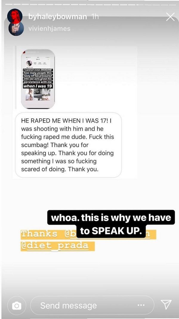 Sự việc đã đến độ cao trào khi một người mẫu trẻ có tên Haley Bowman đã dùng tiếng nói của mình, cập nhật toàn bộ đoạn chat giữa nhiếp ảnh gia và cô trên trang cá nhân, cô không quên tiết lộ rằng anh ta đã từng lạm dụng quyền lực của mình để đe dọa Haley nếu cô dám nói chuyện này ra khi cô chỉ mới 19 tuổi.