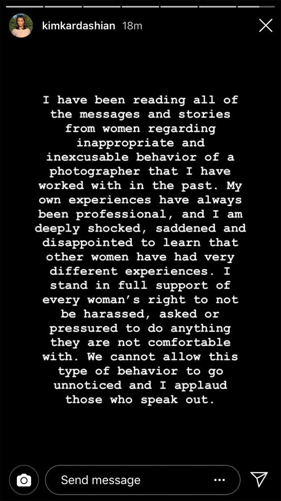 “Tôi đã đọc tất cả các tin nhắn và câu chuyện không thể tha thứ từ một nhiếp ảnh gia mà tôi đã làm việc trong quá khứ khi có hành vi và lời nói vô cùng khiếm nhã với phụ nữ. Thời gian tôi từng làm việc cùng và thấy anh ấy rất nghiêm túc và chuyên nghiệp, sau chuyện này tôi vô cùng sốc, buồn và thất vọng khi biết rằng những người phụ nữ khác đã có những trải nghiệm rất khác nhau. Tôi ủng hộ hết mình cho mọi phụ nữ, quyền không bị quấy rối, yêu cầu hay gây áp lực phải làm bất cứ điều gì họ không thoải mái. Chúng ta không thể cho phép loại hành vi thiếu tôn trọng tất cả phụ nữ này diễn ra trong bất kì trường hợp nào và bản thân tôi rất hoan nghênh khi có người đứng lên