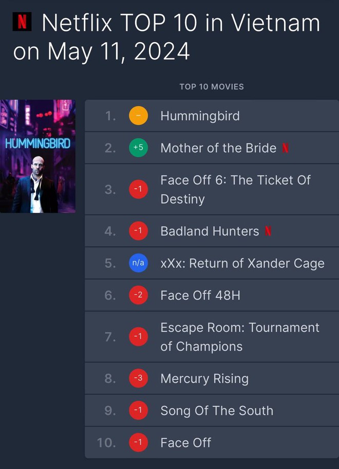 Theo thống kê bởi Netflix Việt Nam, bộ phim Hummingbird (hay còn có tên khác là Redemption - Báo Thù) đã bất ngờ vươn lên vị trí thứ 1 trên BXH phim điện ảnh. Đã ra mắt được một thời gian khá lâu, bộ phim điện ảnh có kinh phí 20 triệu USD (hơn 500 tỷ đồng) này bất ngờ nắm giữ vị trí Quán quân, vượt qua nhiều dự án mới đang hot khiến nhiều khán giả thích thú và tò mò.