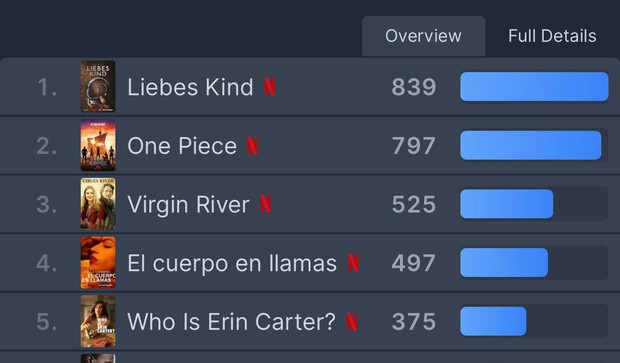 Theo thống kê từ Netflix, dự án phim ngắn tập mang tên Dear Child (hay Liebes Kind) đã xuất sắc chấm dứt chuỗi hạng 1 toàn cầu suốt 2 tuần vừa qua của One Piece. Dự án thuộc thể loại giật gân, kỳ ảo còn xuất sắc đứng hạng 1 ở 50 quốc gia (tính đến ngày 14/9), và lọt top 10 tại hơn 80 nước, trong đó có cả Việt Nam.