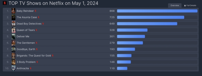 Baby Reindeer đang là series đáng chú ý nhất trên Netflix, giữ vững vị trí top 1 lượt xem toàn cầu trong 2 tuần qua. Bộ phim gồm 7 tập, dựa trên những trải nghiệm có thật của đạo diễn kiêm biên kịch Richard Gadd. Kịch bản lấy cảm hứng từ trải nghiệm của đạo diễn khi anh từng bị một người phụ nữ theo dõi, đeo bám ở tuổi đôi mươi. Nhân vật được đổi tên thành Donny, do chính Gadd đảm nhận. Trong khi đó, vai nữ chính được đặt tên Martha Scott được thể hiện bởi Jessica Gunning.