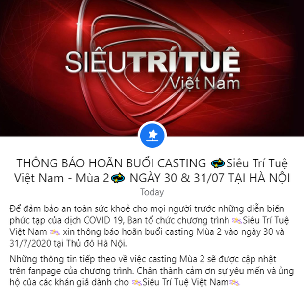 Mùa 2 của "Siêu trí tuệ Việt Nam" cũng đang rục rịch trở lại khi ban tổ chức thông báo về vòng casting ở Hà Nội cũng như TP. Hồ Chí Minh. Tuy nhiên, do tình hình diễn biến dịch Covid-19 đang có chiều hướng phức tạp, ban tổ chức bắt buộc phải dời buổi tuyển sinh ở Hà Nội, dự kiến diễn ra vào 2 ngày cuối tháng 7. Những thông tin tiếp theo sẽ được cập nhật trên trang fanpage của "Siêu trí tuệ Việt Nam".