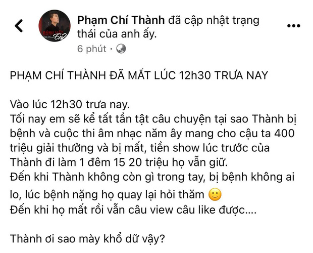 Mới đây, quản lý của Chí Thành cũng xác nhận nam ca sĩ đã qua đời lúc 12h30 ngày 18/12. Đồng thời, tuyên bố sẽ kể tất tần tật câu chuyện tại sao Chí Thành bị bệnh đồng thời "vạch trần" một cuộc thi âm nhạc từng mang cho Chí Thành 400 triệu giải thưởng vào tối nay (18/12).