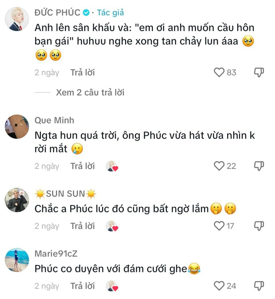 Theo đó, một cặp đôi đã tiến lên sân khấu và chàng trai nói nhỏ với Đức Phúc rằng: 'Em ơi, anh muốn cầu hôn bạn gái'. Sau khi nghe mong muốn của chàng trai, Đức Phúc không giấu được biểu cảm quá bất ngờ. Đức Phúc lập tức thông báo với khán giả về màn cầu hôn sắp diễn ra và nhận được tràng pháo tay cổ vũ cặp đôi.