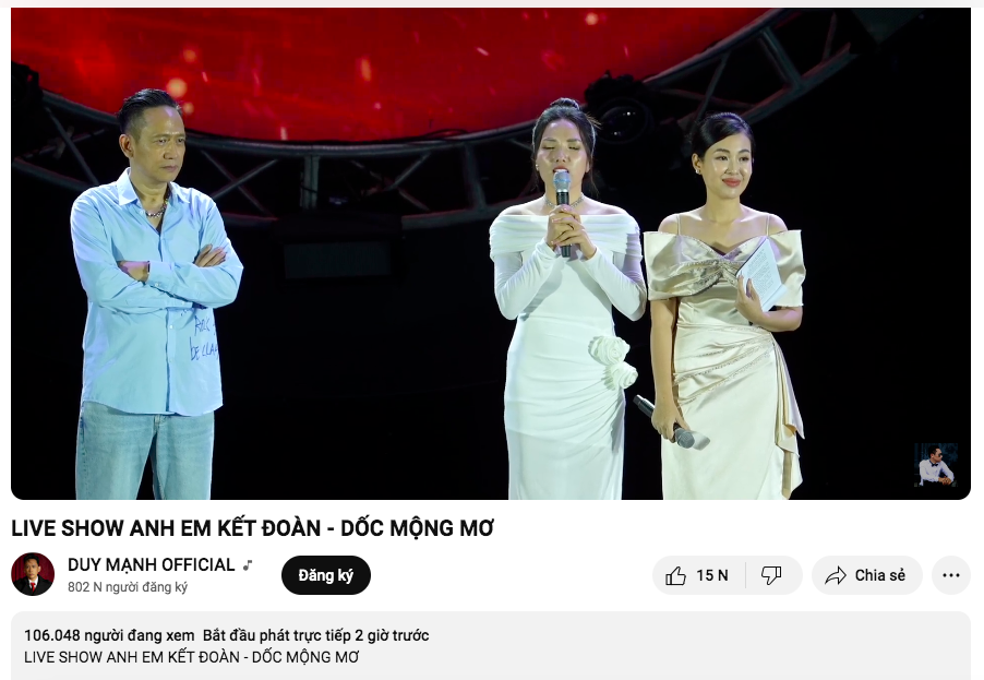 Ngoài hàng nghìn khán giả dự show trực tiếp, liveshow Anh Em Kết Đoàn còn thu hút hàng trăm nghìn người đón xem qua sóng livestream. Chương trình được phát trực tiếp ở hai kênh YouTube của Tuấn Hưng - Duy Mạnh và fanpage Dốc Mộng Mơ.