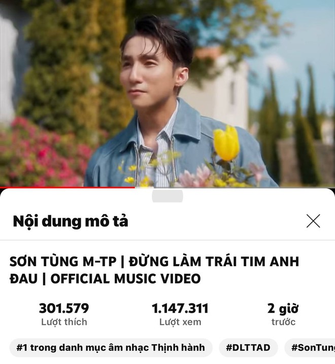 Khoảng 22h00 ngày 8/6, tức chỉ khoảng 2 tiếng sau khi ra mắt, MV Đừng Làm Trái Tim Anh Đau của Sơn Tùng M-TP chính thức đạt vị trí top 1 trending. Trước đó, chỉ khoảng 40 phút sau khi ra mắt, Đừng Làm Trái Tim Anh Đau đã xuất hiện ở ngay vị trí top 2 trending.