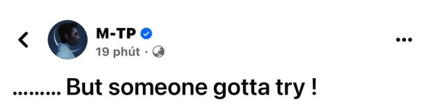 Tối 17/2, Sơn Tùng bất ngờ chia sẻ lên trang cá nhân dòng trạng thái vô cùng ngắn gọn: "... But someone gotta try" (... Nhưng ai đó cần phải cố gắng). Tất nhiên không hề trùng hợp khi mới hôm qua, "nàng thơ" Hải Tú cũng đã chia sẻ dòng trạng thái ẩn ý: "No one can change the past..." (Không ai có thể thay đổi quá khứ...).