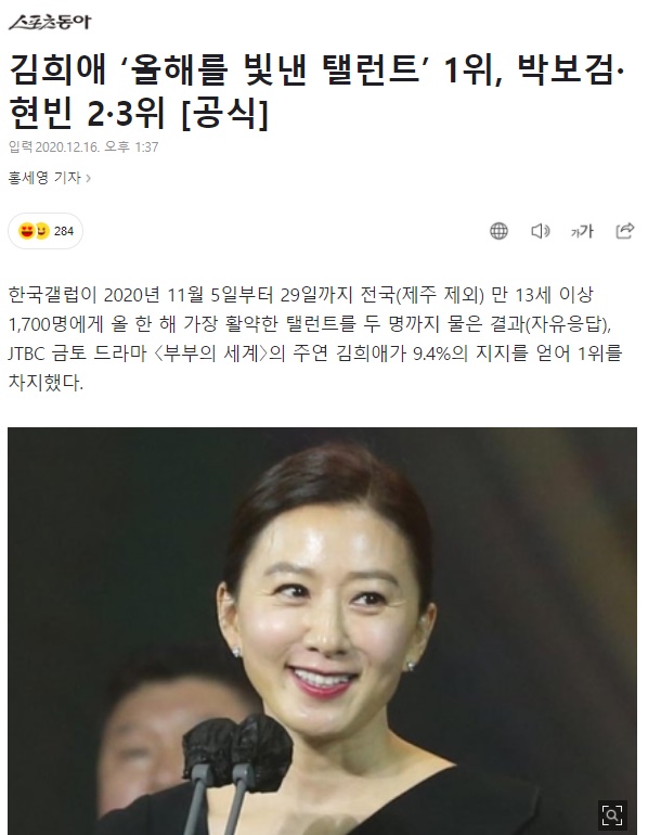 Theo đó, với thành công từ vai diễn trong phim Thế giới hôn nhân, Kim Hee Ae chính thức trở thành diễn viên nổi tiếng nhất Hàn Quốc năm 2020. Được biết, nữ diễn viên chiếm 9,4% số lượng bình chọn.