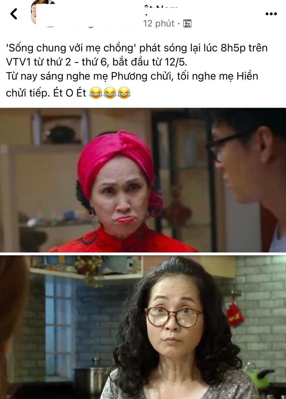 Tạo nên cơn sốt ở thời điểm lên sóng vào năm 2017, 'Sống chung với mẹ chồng' vẫn luôn được khán giả yêu phim truyền hình nhớ và nhắc đến nhiều sau này. Đài Truyền hình Việt Nam sẽ phát sóng lại 34 tập phim 'Sống chung với mẹ chồng' trên kênh VTV1 vào khung giờ 8h05 từ thứ Hai đến thứ Sáu hàng tuần, bắt đầu từ ngày 12/5.