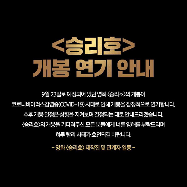 Theo đó, chiều 27/8, nhà sản xuất của bộ phim đã đưa ra thông báo vì tình hình dịch bệnh tại Hàn Quốc bất ngờ bùng phát nên kế hoạch công chiếu trên toàn quốc vào ngày 23/9 mới đây phải tạm hoãn và phải chờ tình hình ổn định mới có thể đưa ra thông báo chính thức thời điểm phim công chiếu.