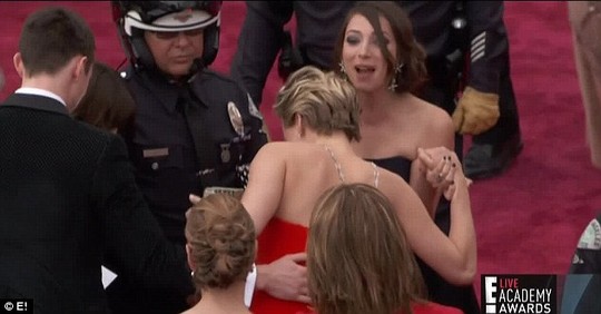 Một đám đông trợ lý, vệ sĩ... bên cạnh lập tức giúp Jennifer Lawrence giữ thăng bằng và bước tiếp nhưng nữ diễn viên này đứng không vững và tiếp tục vấp ngã, lần này ngồi thẳng xuống sàn cầu thang.