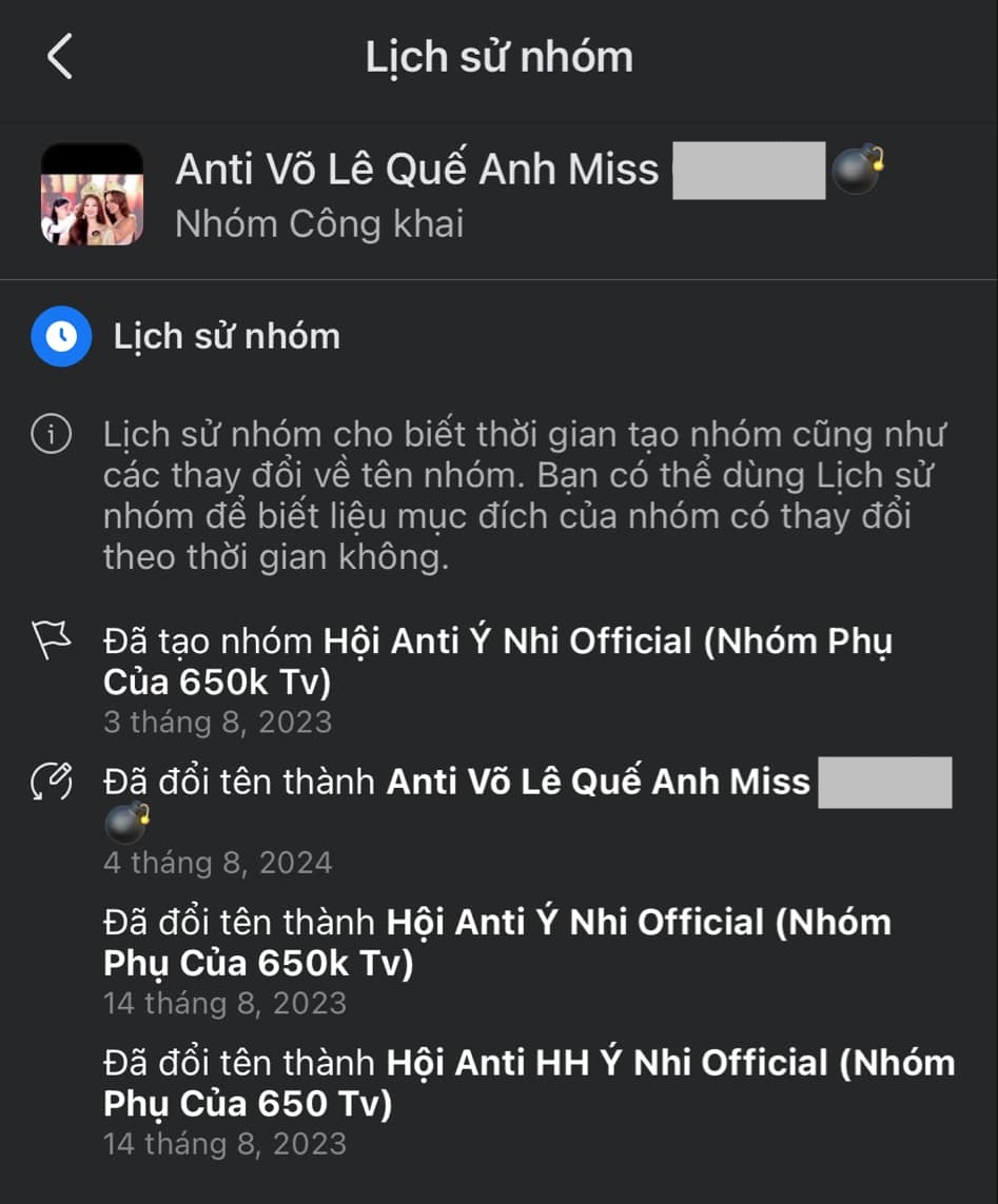 Tuy nhiên điều đáng nói hơn cả lại ở phần lịch sử của group này. Theo đó group anti Quế Anh vốn có tên là “Hội Anti Ý Nhi Official”, thành lập từ ngày 14/8/2023. Đến ngày 4/8/2024, sau khi Quế Anh đăng quang được 1 ngày thì được đổi tên thành nhóm anti Quế Anh.