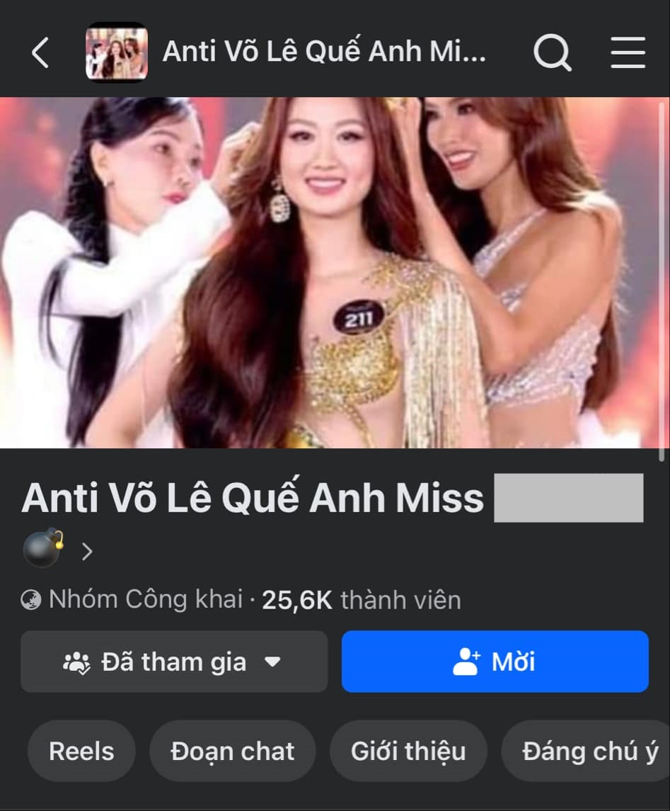 Mới nhất, trên Facebook còn xuất hiện hàng loạt group anti Hoa hậu Quế Anh, trong đó nhiều thành viên nhất là Anti Võ Lê Quế Anh Miss ** *** với gần 26 nghìn thành viên. Phần lớn các bài viết trong nhóm bóc tách những tình tiết chưa được xác thực về Hoa hậu Quế Anh cũng như BTC Miss Grand Vietnam 2024. Các bài đăng trong nhóm đều thu hút rất nhiều bình luận từ cư dân mạng.