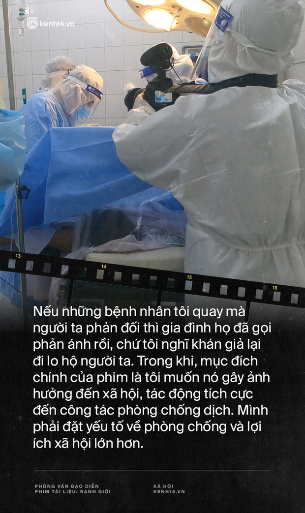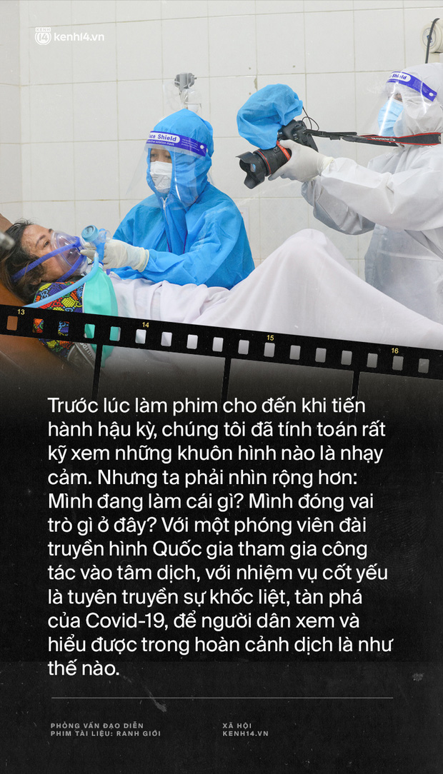 Thực ra trước lúc làm phim cho đến khi tiến hành hậu kỳ, chúng tôi đã tính toán rất kỹ xem những khuôn hình nào là nhạy cảm. Nhưng ta phải nhìn rộng hơn: Mình đang làm cái gì? Mình đóng vai trò gì ở đây? Với một phóng viên đài truyền hình Quốc gia tham gia công tác vào tâm dịch, với nhiệm vụ cốt yếu là tuyên truyền sự khốc liệt, tàn phá của Covid-19, để người dân xem và hiểu được trong hoàn cảnh dịch là như thế nào. Trong phim, nó hiện rõ 3 yếu tố: