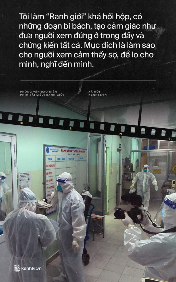 Đúng. Khi làm hậu kỳ phim, tôi cũng tính toán rất kĩ. Đã có rất nhiều dữ liệu tôi để lại, bởi tôi muốn để người xem cảm nhận câu chuyện một cách từ từ, không bị ngợp. Tôi làm "Ranh giới" khá hồi hộp, có những đoạn bí bách, tạo cảm giác như đưa người xem đứng ở trong đấy và chứng kiến tất cả. Mục đích là làm sao cho người xem cảm thấy sợ, để lo cho mình, nghĩ đến mình. Nhưng sợ thế nào chỉ vừa phải và đúng độ thôi, nếu quá, sẽ có những người sợ mà… tắt đi không xem nữa. Chính vì thế, những điều đó được chúng tôi cân nhắc khá kĩ khi làm hậu kì. Quan trọng nhất, mình đóng góp được 1 sản phẩm đưa nó vào công cuộc tuyên truyền để chống sự tàn phá của Covid-19.
