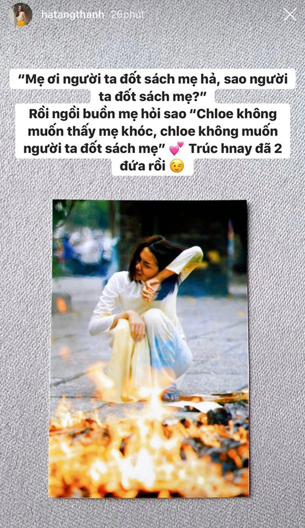 Khi được xem hình ảnh của mẹ, con gái Tăng Thanh Hà là Chloe Nguyễn đã thắc mắc: "Mẹ ơi người ta đốt sách mẹ hả, sao người ta đốt sách mẹ. Chloe không muốn mẹ khóc, Chloe không muốn người ta đốt sách mẹ". Chia sẻ đầy ngây thơ, đáng yêu của Chloe Nguyễn khiến trái tim của Tăng Thanh Hà và khán giả "tan chảy".
